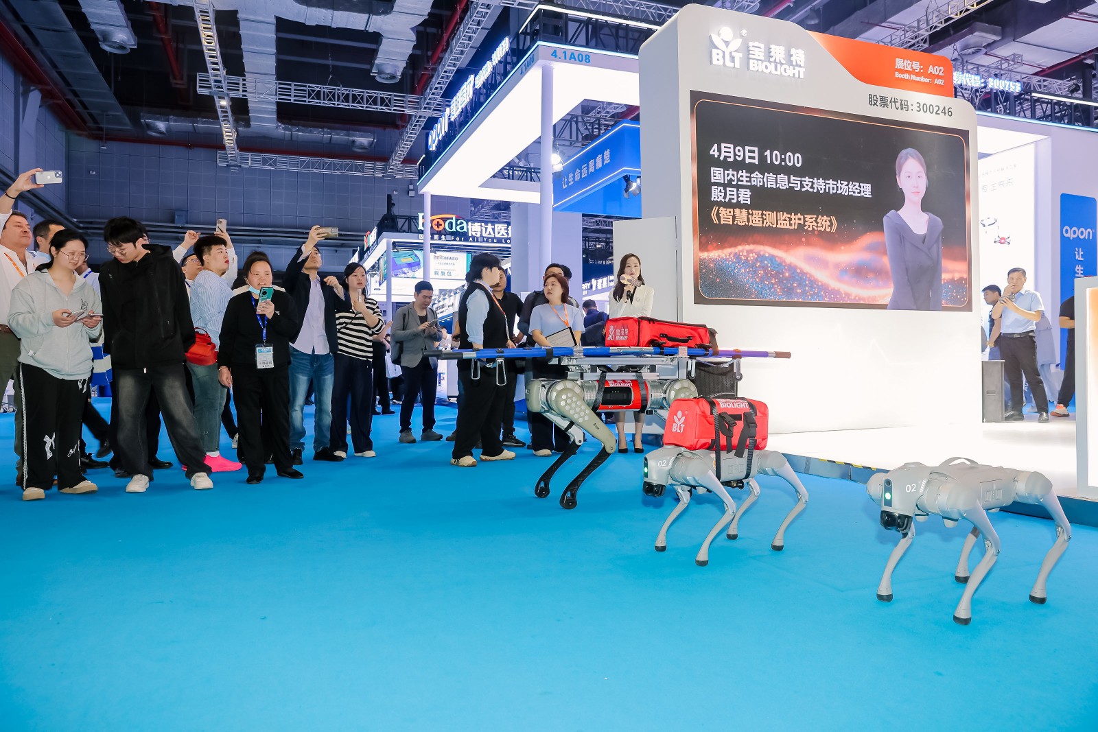 市场总监曾晓淳结合四足机器人动态演示,展示心电设备与远程云平台的协同效能。机器人搭载动态血压监测仪穿越障碍,实时数据同步至心电工作站,诠释“移动精准医疗”理念,观众直呼“未来已来”。